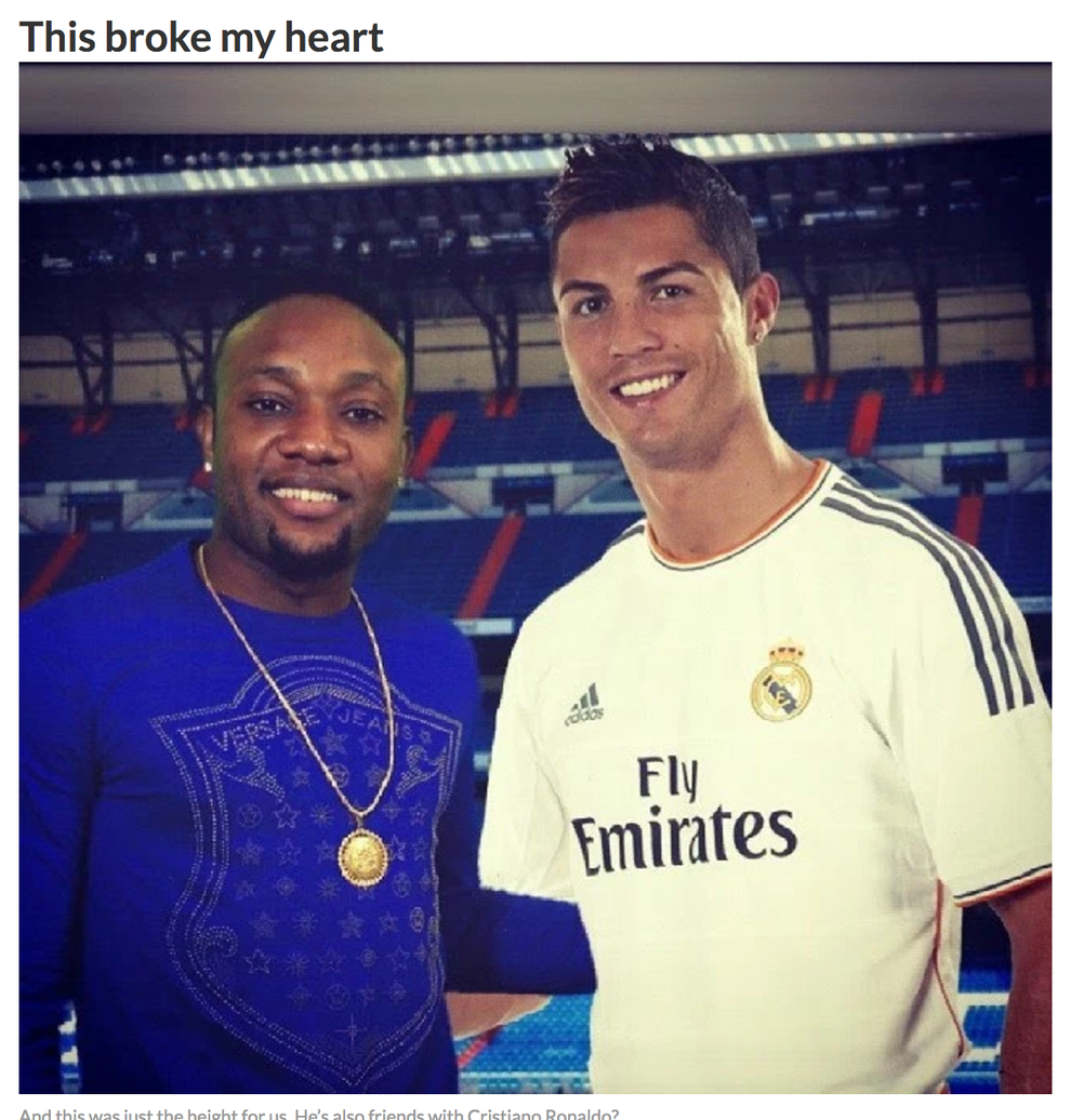 But perhaps the most extraordinarily hilarious one (that appears to be deleted, or in an older archive) dates back to 2014. A site that called out several photos of Kcee's allegedly"dubios photoshop fails" included this photo "with" Cristiano Ronaldo. As you can see, Kcee is missing a left arm and Ronaldo is missing his right one.